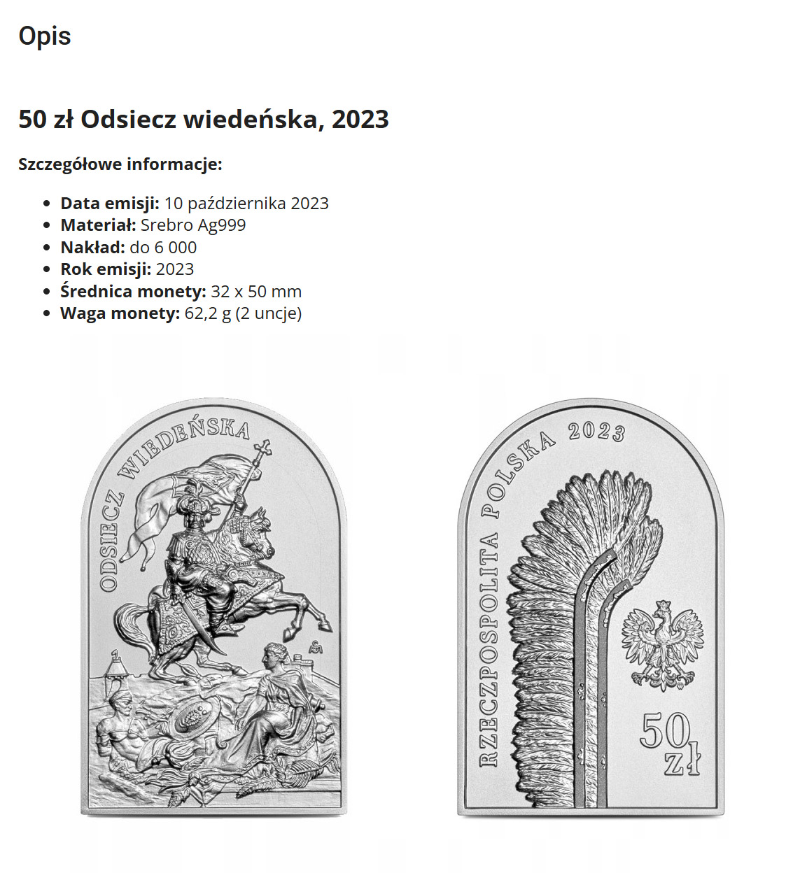 Awers: centralnie skrzydła husarskie, z prawej strony wizerunek orła ustalony dla godła Rzeczypospolitej Polskiej, pod orłem, po prawej stronie, znak mennicy: m / w, poniżej napis: 50 / zł, wzdłuż lewego brzegu, od dołu ku górze, napis: RZECZPOSPOLITA POLSKA 2023